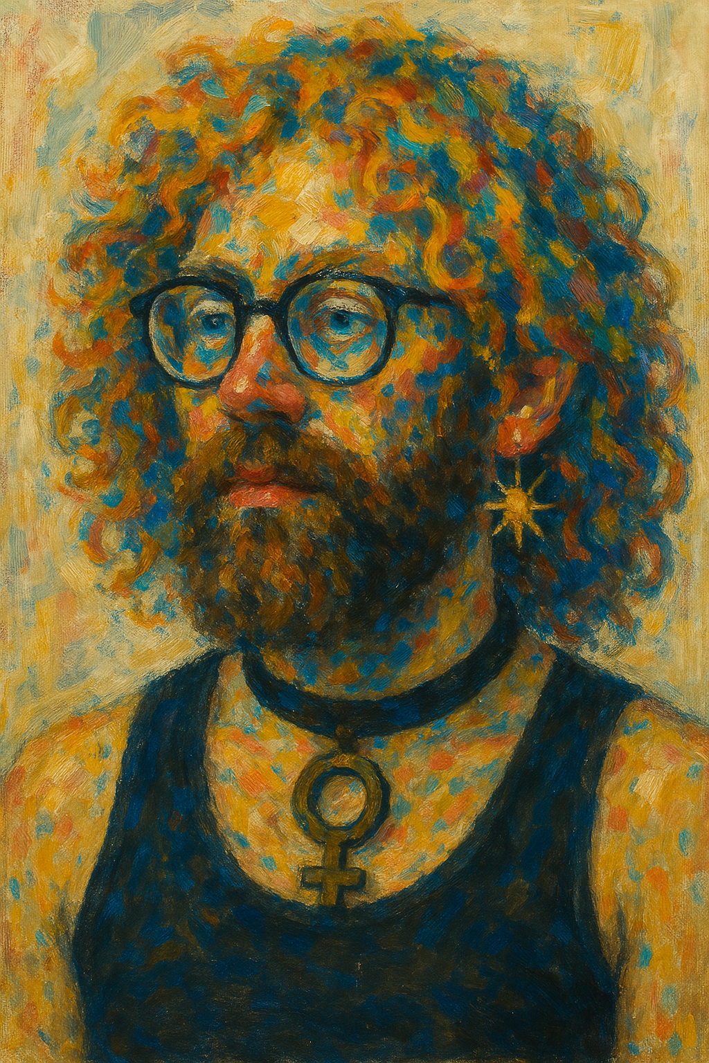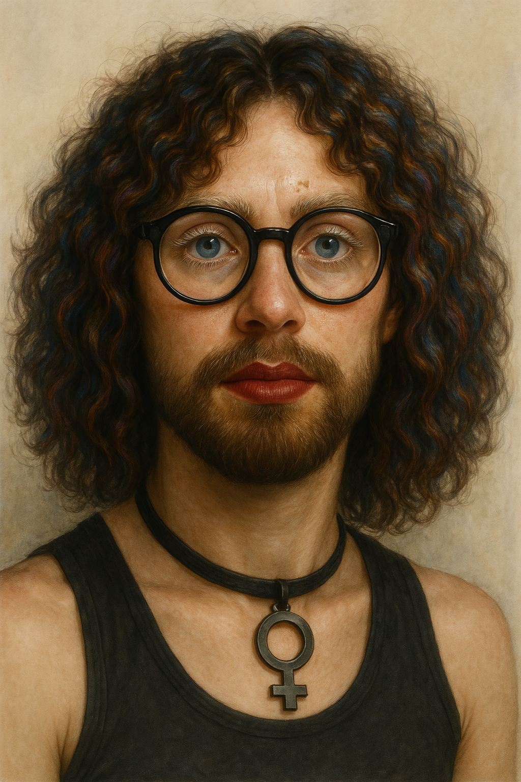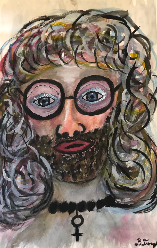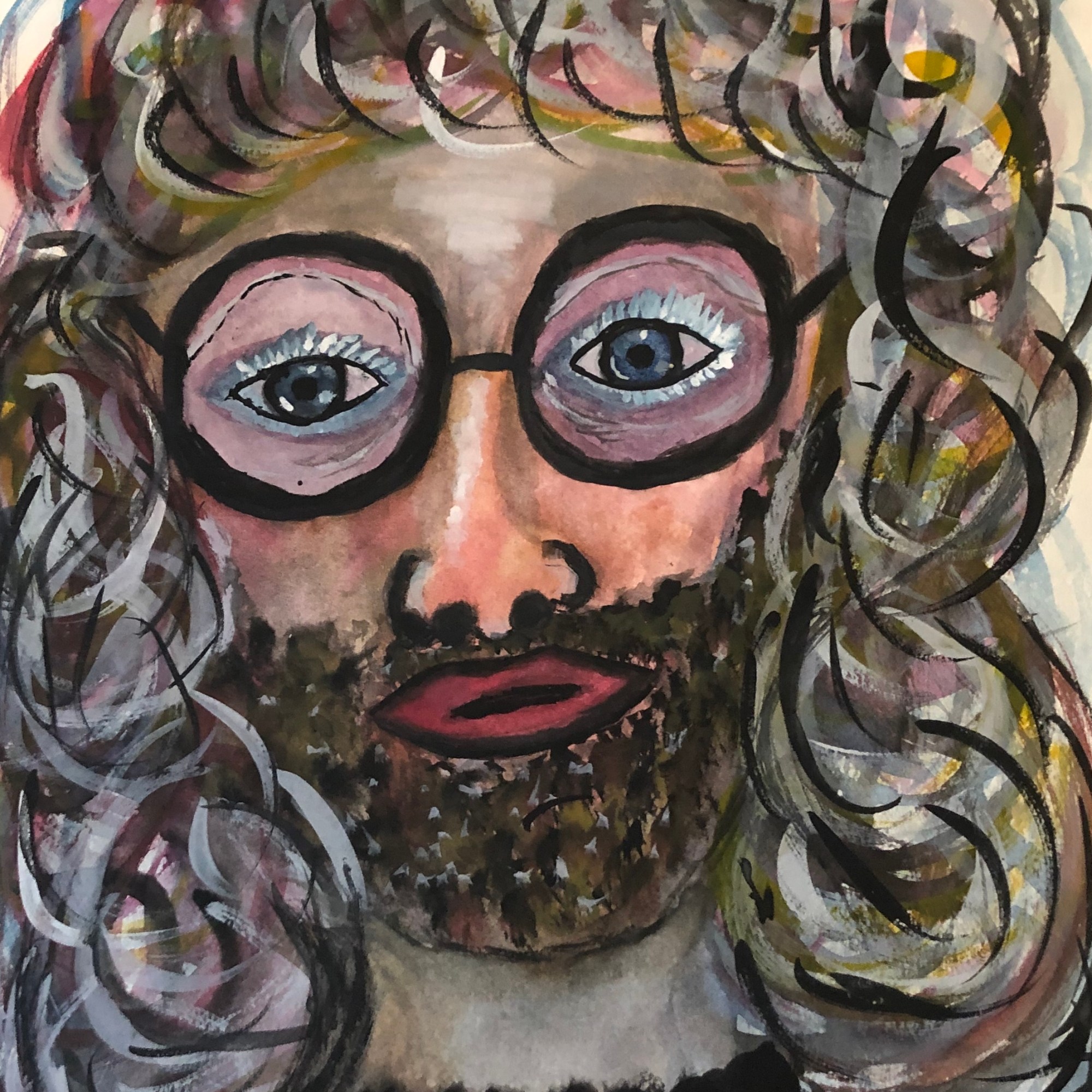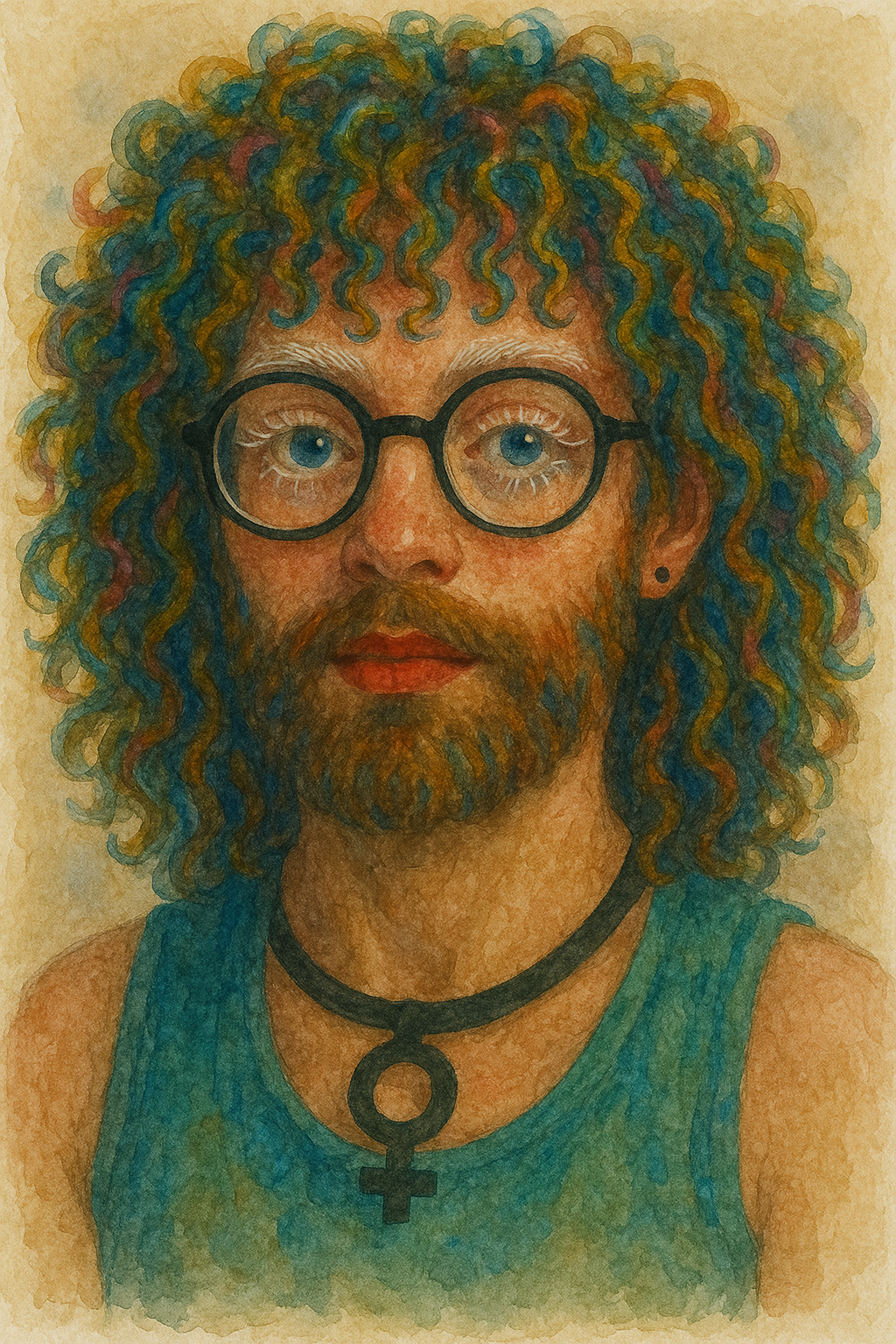 A detailed artistic portrait in watercolor and mixed media depicting a person with distinctive features. The individual has curly, voluminous hair filled with strokes of gray, black, and accents of yellow, blue, and subtle hints of pink. They wear round, oversized glasses with thick black frames, highlighting wide, expressive blue eyes detailed with pale eyelashes and soft pink eyelids. The person’s face has pronounced lips colored deep red and a beard painted with textured brushstrokes, mixing shades of brown, black, and gray. Around their neck is a bold black choker-style necklace with a prominent pendant featuring the female gender symbol. The overall style is expressive, bold, and somewhat surreal, with abstracted and stylized elements throughout, rendered against a muted, watercolor-washed background+make the hair shoulder length and add more colors to it, make the eye lashes and eye brows white