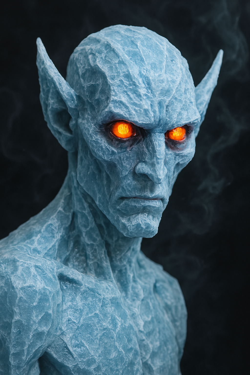 Can you do this again but make him look like he’s made out of ice keep the glowing eyes.