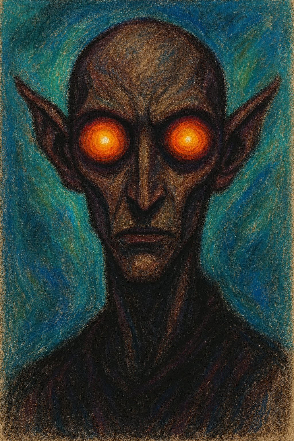 An eerie, surreal character portrait rendered in bold pastels, featuring an alien or otherworldly figure with angular, exaggerated features and an unsettling intensity. The figure has a long, sharply defined face with deep brown, almost earthen-toned skin, smudged and shaded with soft charcoal-like texture that gives the image a dreamlike, powdery quality. The most arresting feature is the character’s oversized, glowing orange-red eyes. The eyes are orb-like and slightly bulging, constructed from concentric circles of blazing amber, burnt sienna, and crimson, with a glowing yellow core that seems to pulse with internal heat—suggesting either fire, vision beyond human comprehension, or some kind of contained power. The eyes are rimmed with a deep plum shadow, blending into the face and giving the appearance of bruising or prolonged sleeplessness. The figure’s ears are long, pointed, and slightly curled, adding to the inhuman or fantastical design, while the nose is angular and drawn with sharp, harsh lines that slash across the otherwise soft gradients of the face. The mouth is painted in a muted, matte plum shade, expressionless yet slightly downturned, suggesting solemnity, curiosity, or concealed emotion. The background is a swirling, abstract mix of vibrant turquoise, deep marine blue, and patches of emerald green, with visible pastel strokes giving the piece a kinetic, chaotic atmosphere—as though the figure is suspended in a storm of emotion, memory, or psychic noise. The brushwork or pastel marks in the background contrast the stillness of the character, hinting at motion around a central observer. The character’s neck is elongated and shadowed, blending seamlessly into the background in a way that suggests they are either emerging from or dissolving into the space around them. There is no clothing or adornment—just the raw, sculptural simplicity of the form against the energetic swirl of color.