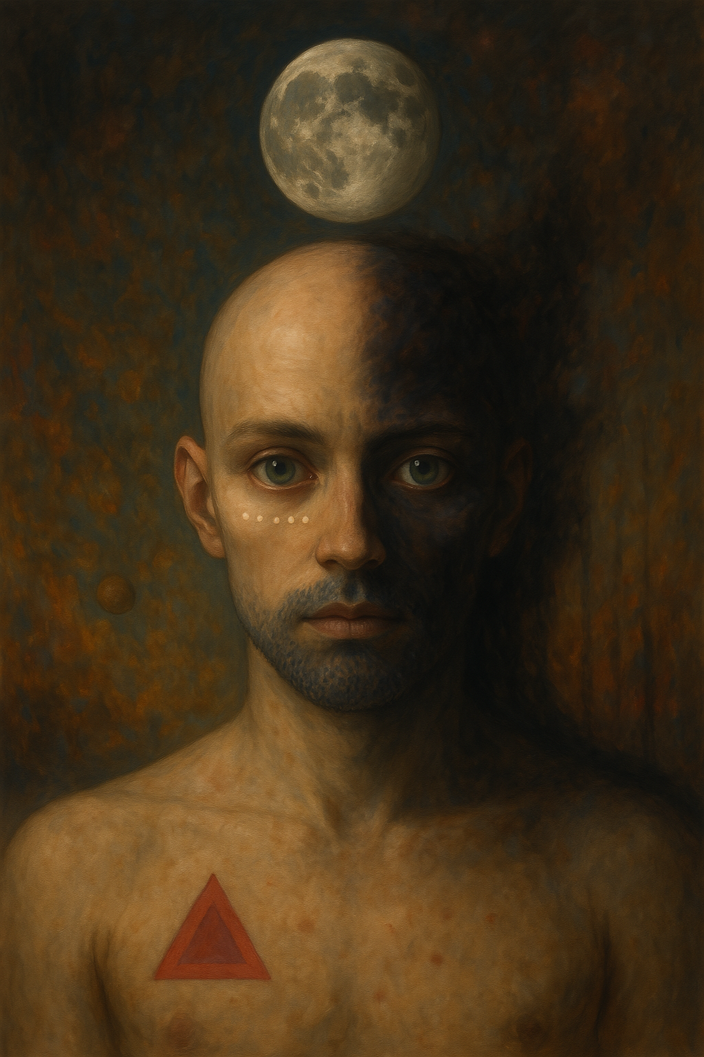 On the left side of the chest, a vivid blood-red triangle outlined in magenta is tattooed or embedded into the figure’s flesh, stark and geometric against the soft, rounded human contours. It evokes symbols of alchemy, identity, or ritual significance—an abstract insignia carved from meaning beyond the visible world.