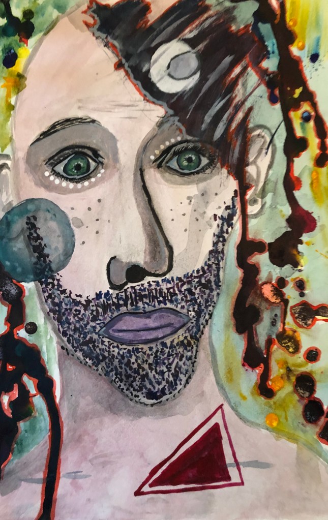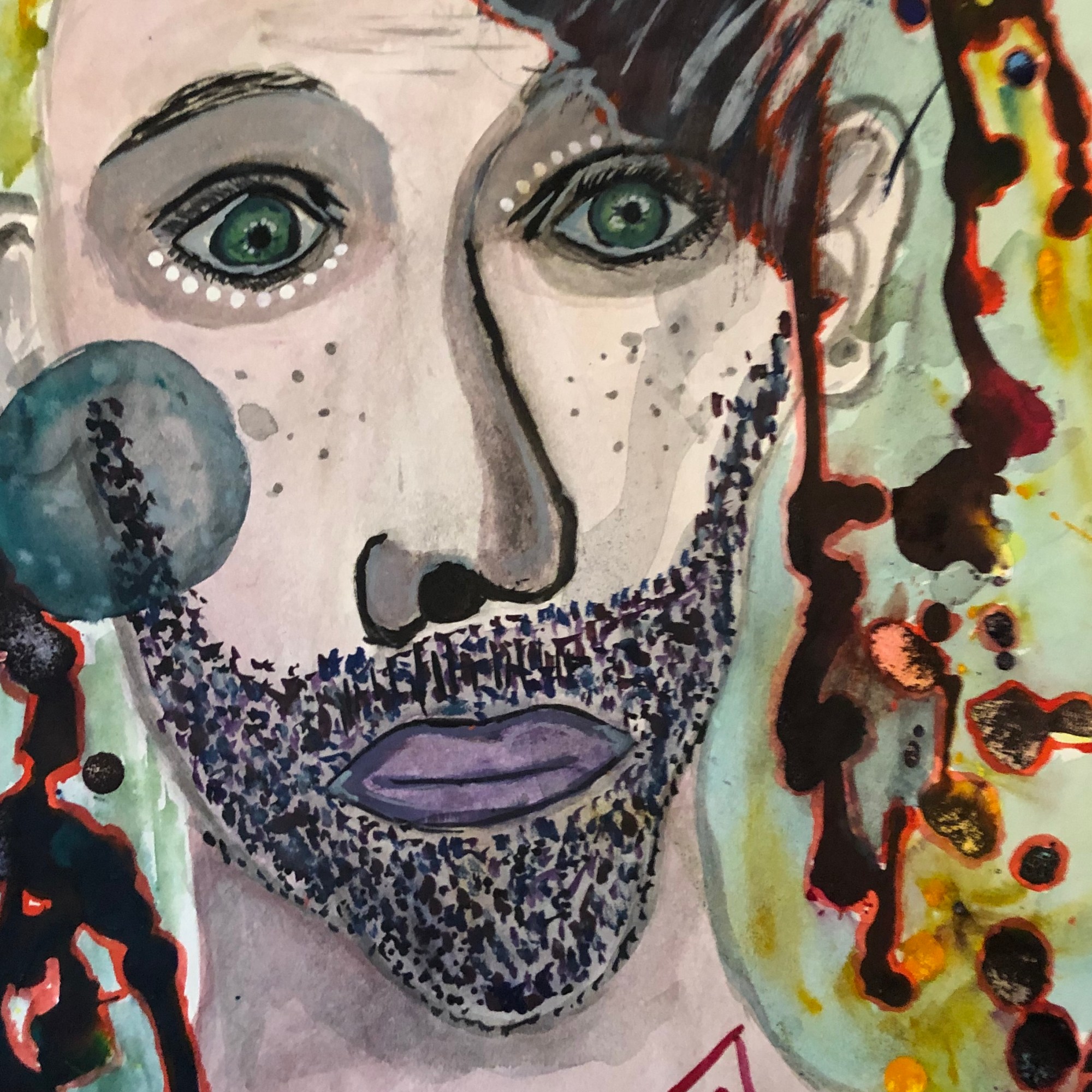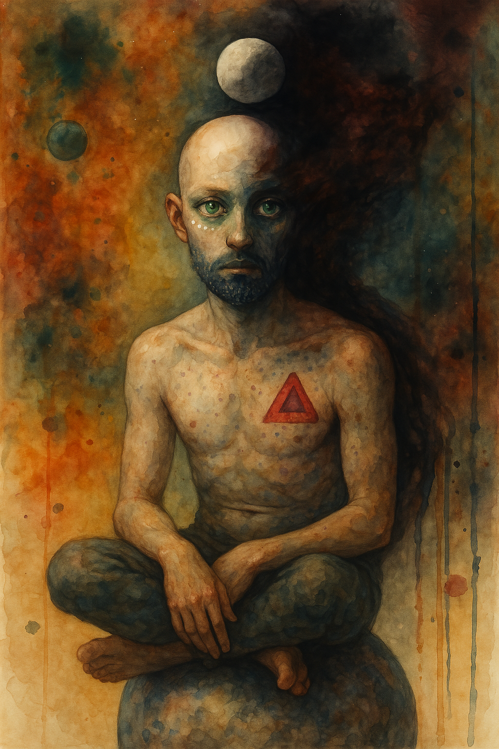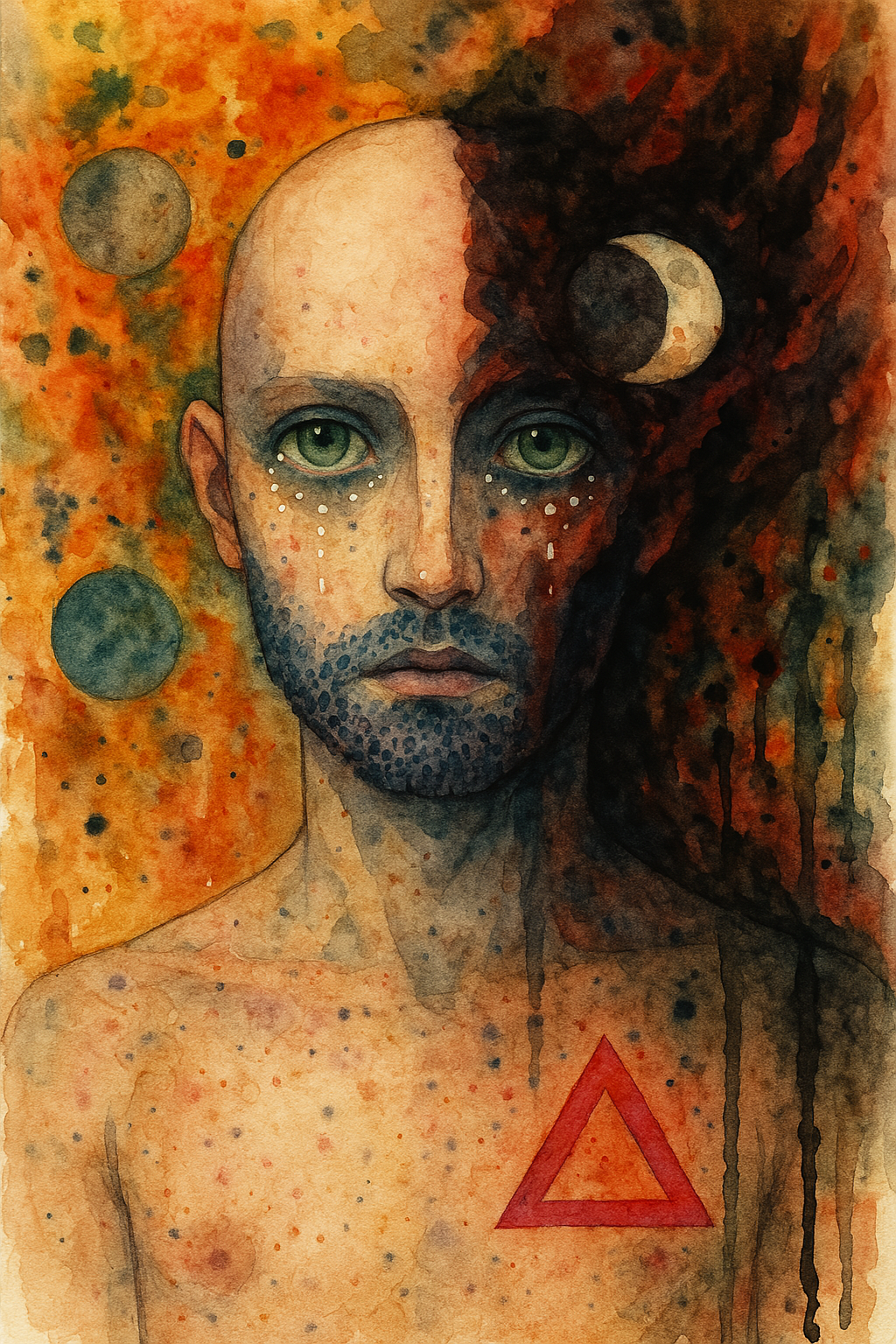Use this prompt to generate a watercolor or mixed media portrait of an androgynous, celestial-marked humanoid figure with one half of their face emerging from darkness. The background should bleed with psychedelic chaos, ink drips, and planetary symbols. The figure should possess pale green eyes, a pointillist beard, lavender lips, and a red triangle on the chest—an entity caught between universes, both witness and relic.