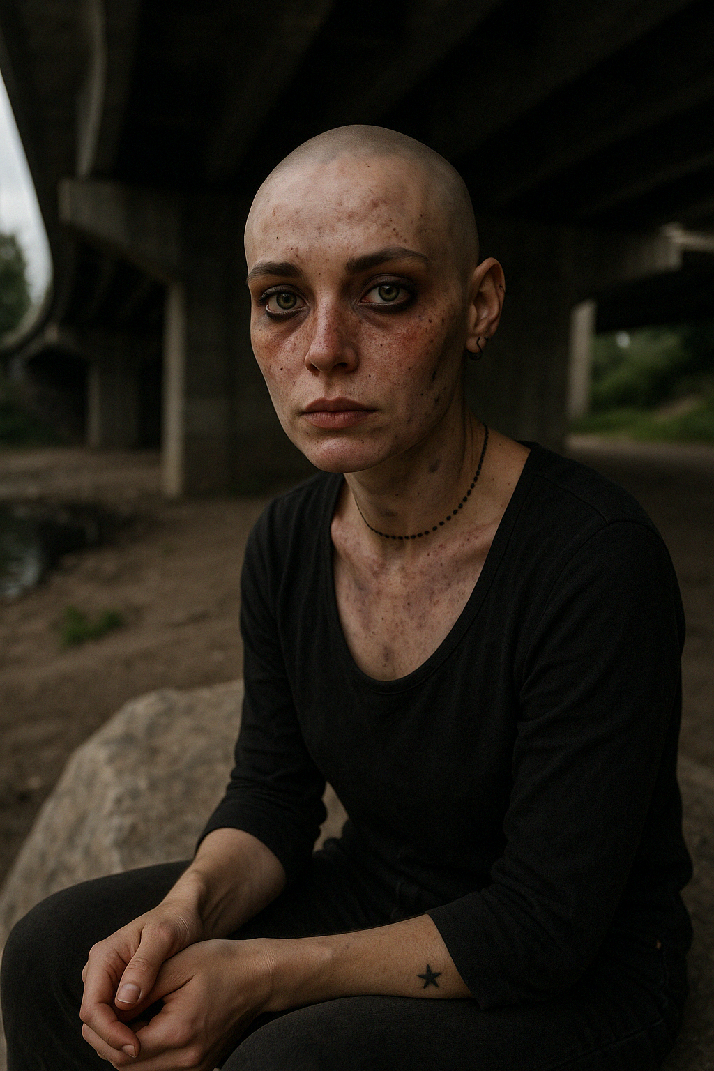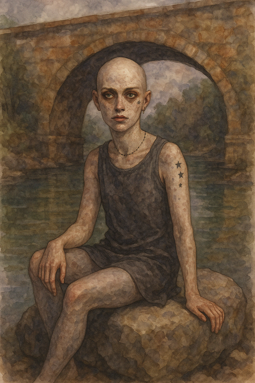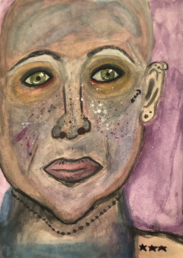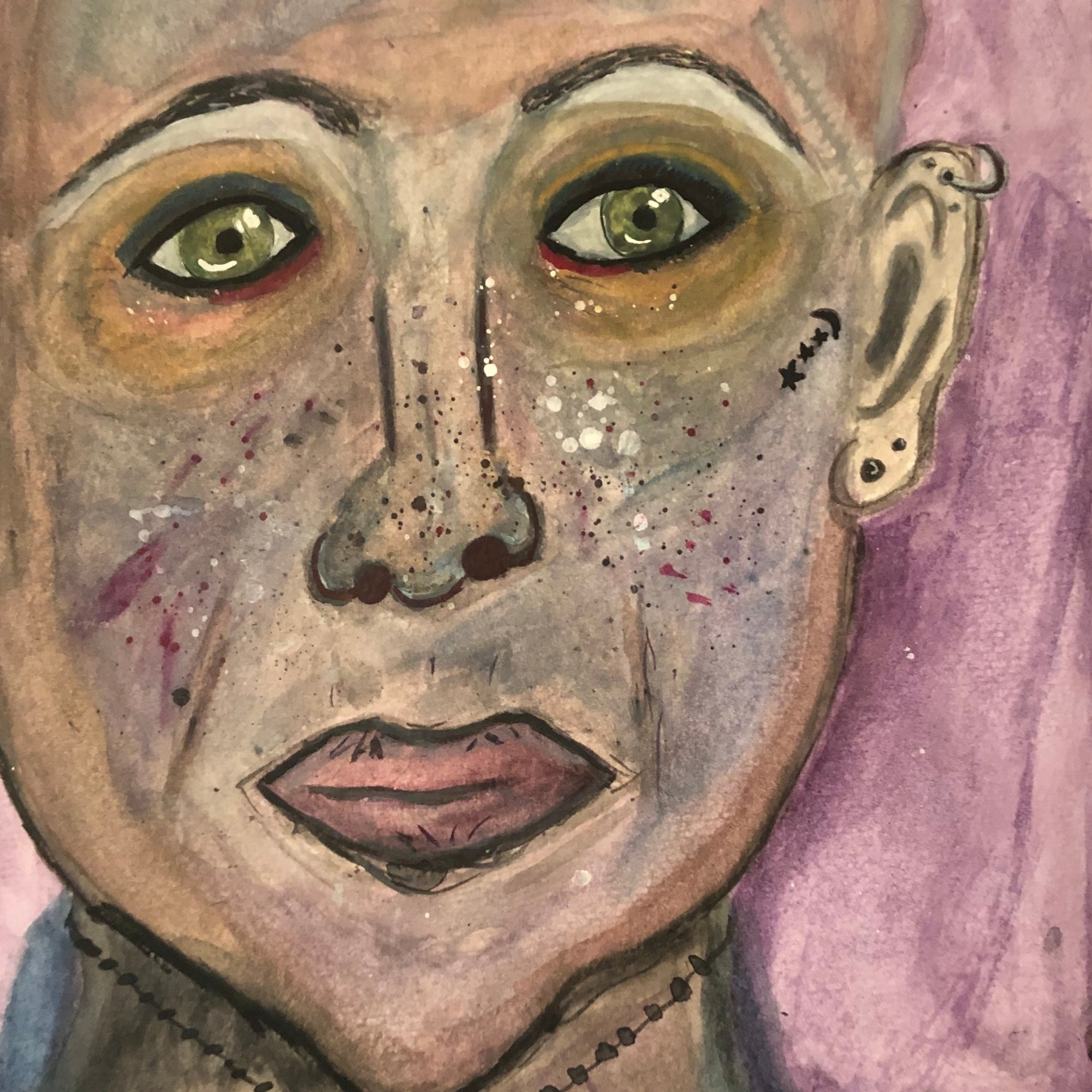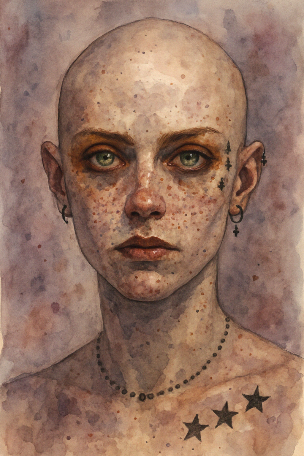 A richly expressive and haunting watercolor portrait of a bald, androgynous figure rendered with raw vulnerability and symbolic detail. The subject fills the frame with a direct, unwavering gaze—green-hazel eyes wide and lucid, framed by smudged ochre and rust-toned shadows that give a sense of exhaustion, wisdom, or emotional burden. Dark eyeliner rings the eyes, softening into red at the inner corners, as if worn from tears or sleepless nights. The skin is painted in mottled, bruised shades of mauve, gray, and lavender, textured with layered washes and spattered droplets of white, black, and crimson. These splatters—concentrated across the cheeks and nose—appear like a constellation of freckles, wounds, or stardust. The texture suggests a narrative lived on the surface, a face marked by story, struggle, and survival. The lips are pursed but full, shaded in deep rose with darkened creases, shaped into a knowing, contained expression—neither smile nor frown, but something held between. The nose is softly sculpted but defined with darker markings around the nostrils, subtly animalistic or ritualistic in tone. On the right side of the face, three small black star tattoos arc upward from the cheekbone, joined by an earring and subtle ornamental linework on the ear. There’s an echo of celestial or tribal markings—quiet symbols of identity, resilience, or cosmic kinship. Along the neckline, a dotted choker-like string of dark beads arcs upward, like an inked rosary or protective charm. The shoulders are just visible. On the left, near the collarbone, is a tattoo of three black stars in a straight line—mirroring the curve of stars on the cheek, but with a militant or declarative placement. The background is a soft wash of bruised lilac and dusty pink, blending into smoky shadows that create the feeling of an interior world, both intimate and mythic. Use this prompt to generate a stylized watercolor portrait of a bald, androgynous figure with glowing green eyes, ochre eye shadows, cosmic freckling, and facial tattoos. The expression should be calm but intense, and the entire face and background layered with soft bruised tones, ink splatters, and celestial symbolism. Capture the feeling of someone who has seen both beauty and destruction—and still chooses to look outward.
