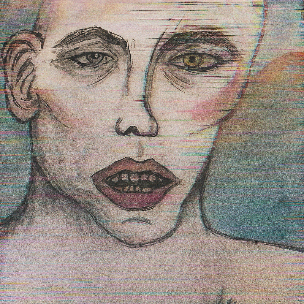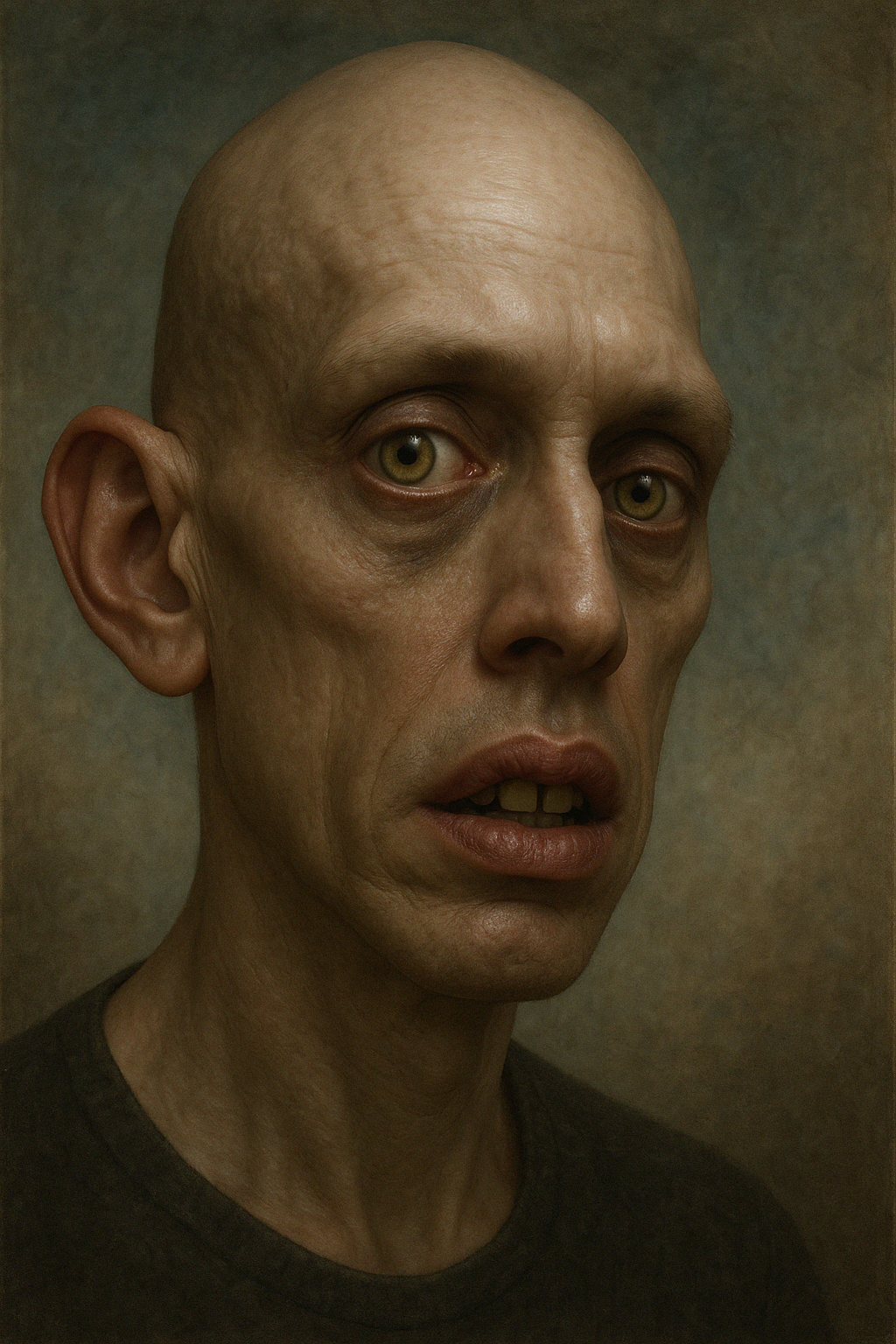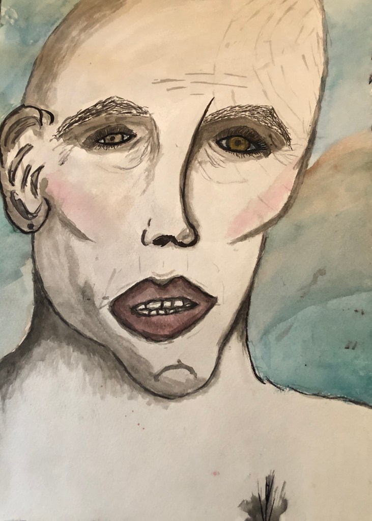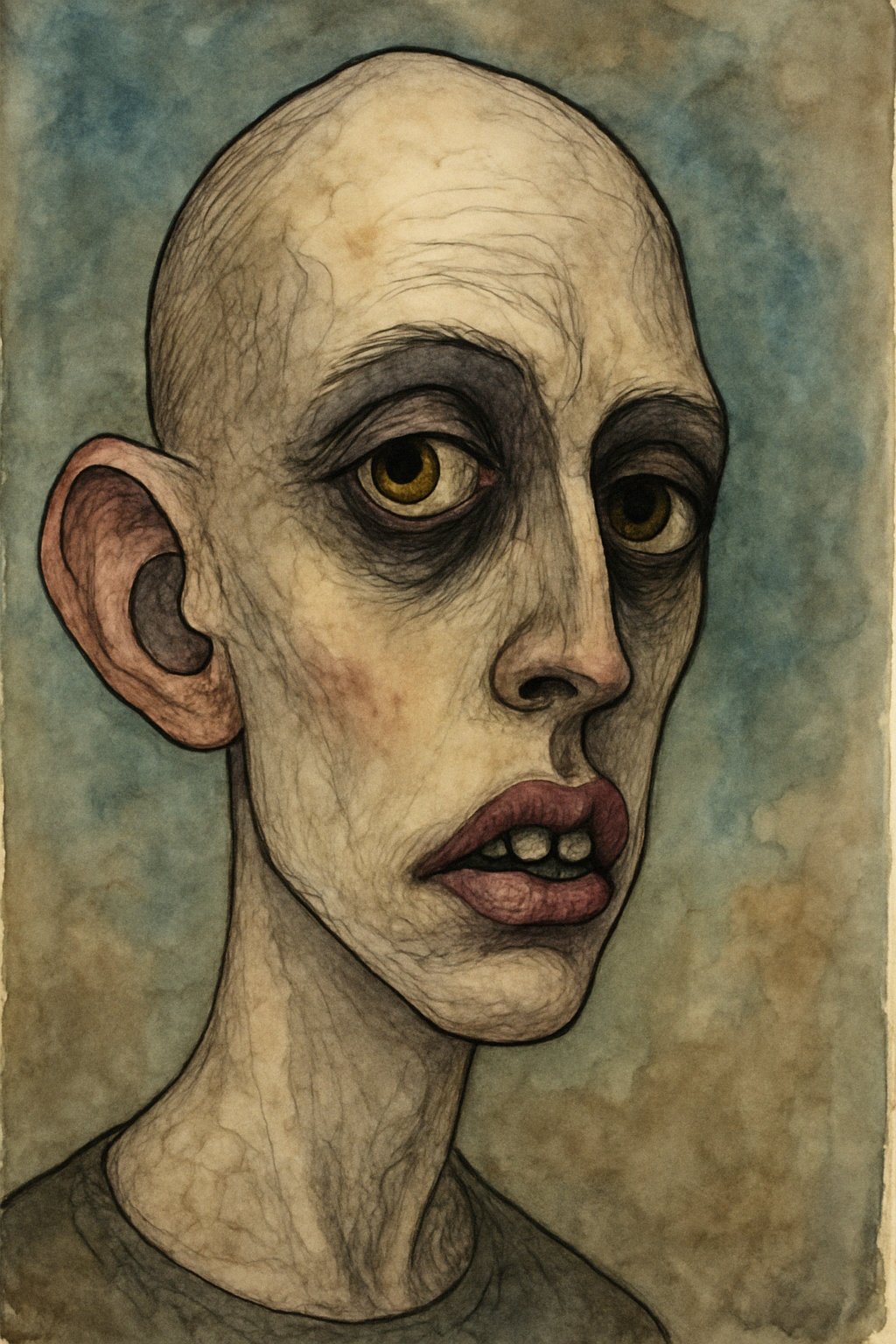 “Create a surreal, hand-drawn watercolor and ink portrait of a bald, androgynous figure. Emphasize asymmetry and distortion in the facial features: elongated head, off-center nose, oversized ear, and deep-set eyes with gold irises. The figure should have prominent, mauve-colored lips slightly parted to reveal uneven teeth, soft blush on the cheeks, and textured shading around the eyes. Use a muted, dreamlike background with blue, green, and brown watercolor washes. Maintain a melancholic, uncanny atmosphere throughout.”