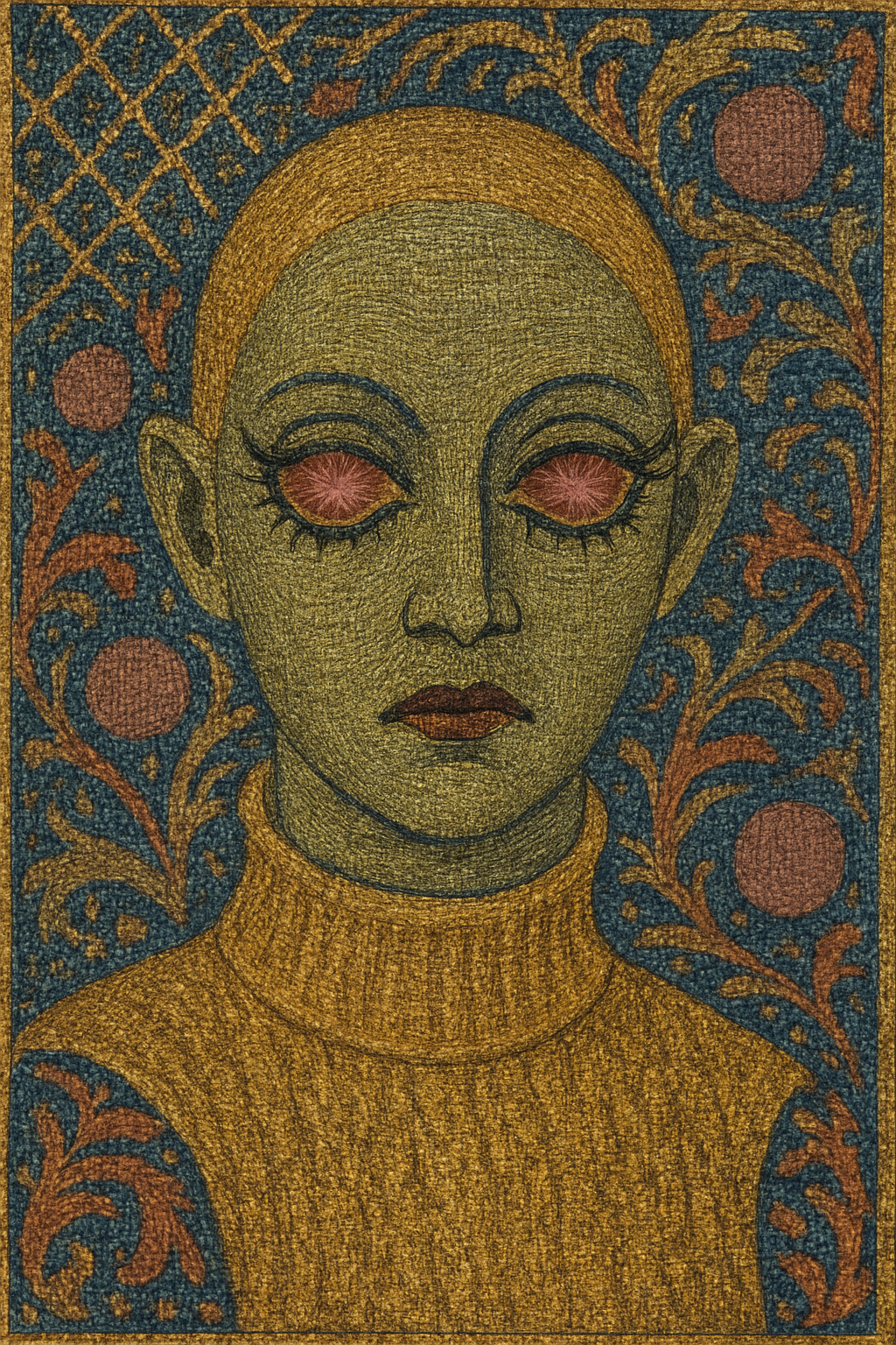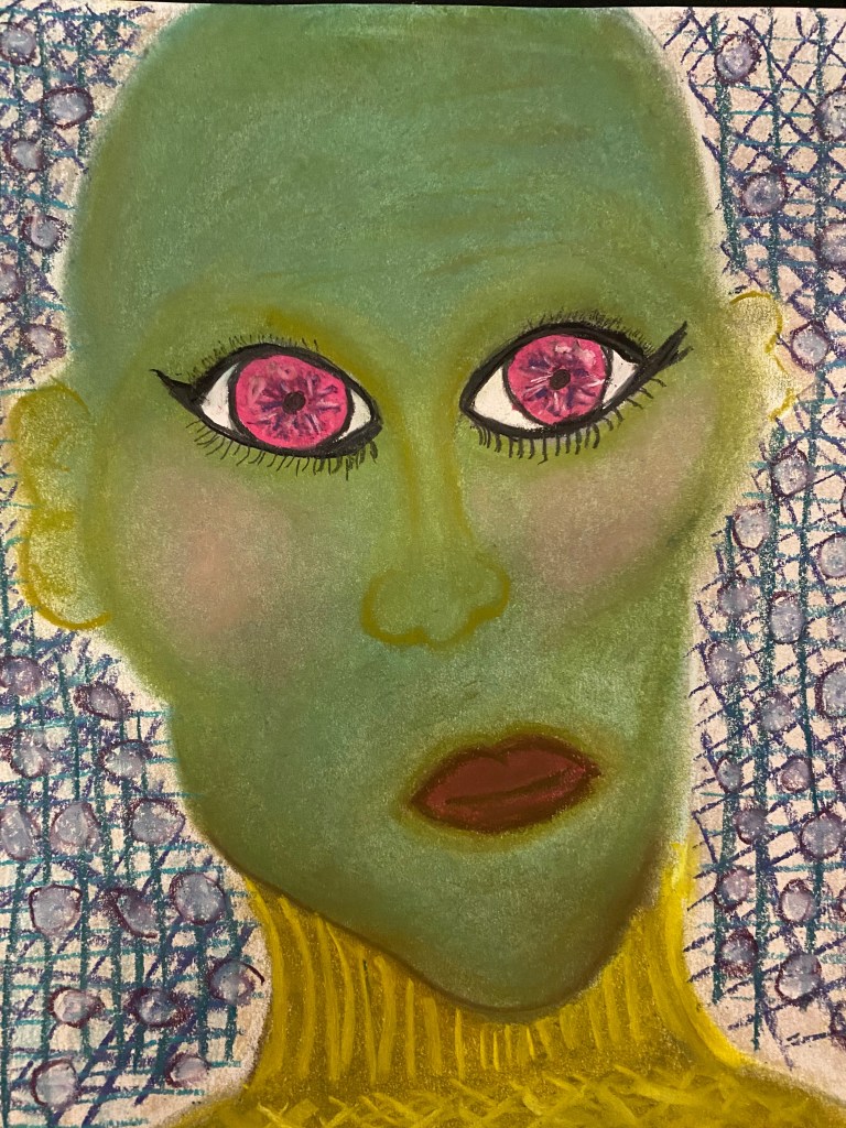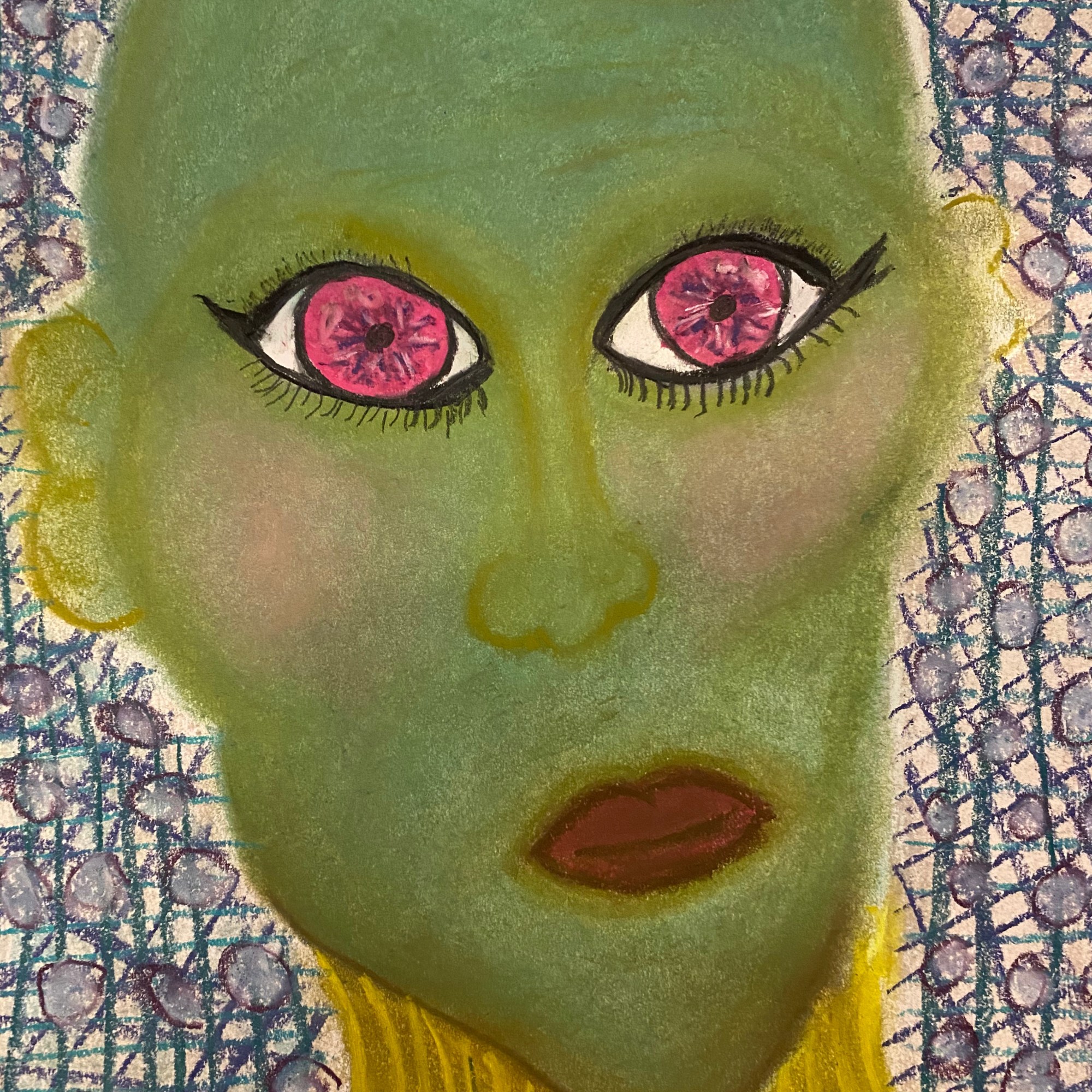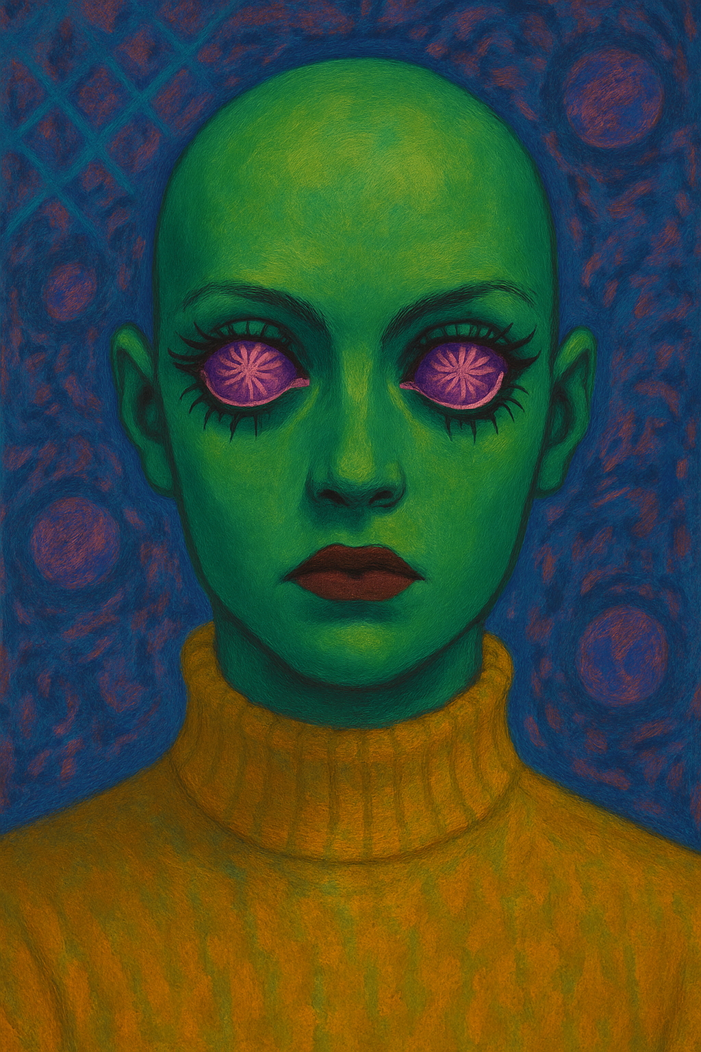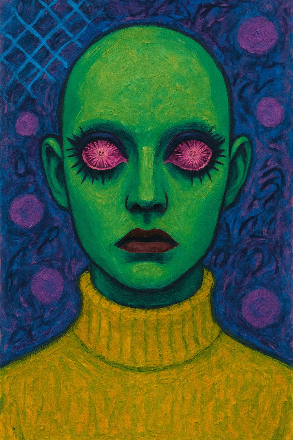 A green-skinned figure with a smooth, bald head stares forward, its expression unreadable. The eyes are wide, unnaturally large, and impossibly pink—each iris blooming like a strange flower or exploding star. Its eyeliner is thick and deliberate, lashes drawn in long strokes that frame the surreal gaze. The lips are painted deep burgundy, set in a slight frown. Yellow fabric rises to the neck in a turtleneck-like texture, suggesting clothing, though the material almost feels like part of the figure itself. The background is patterned and chaotic—blue netting, violet orbs, and scribbled marks surround the figure, like static or interference in a signal.