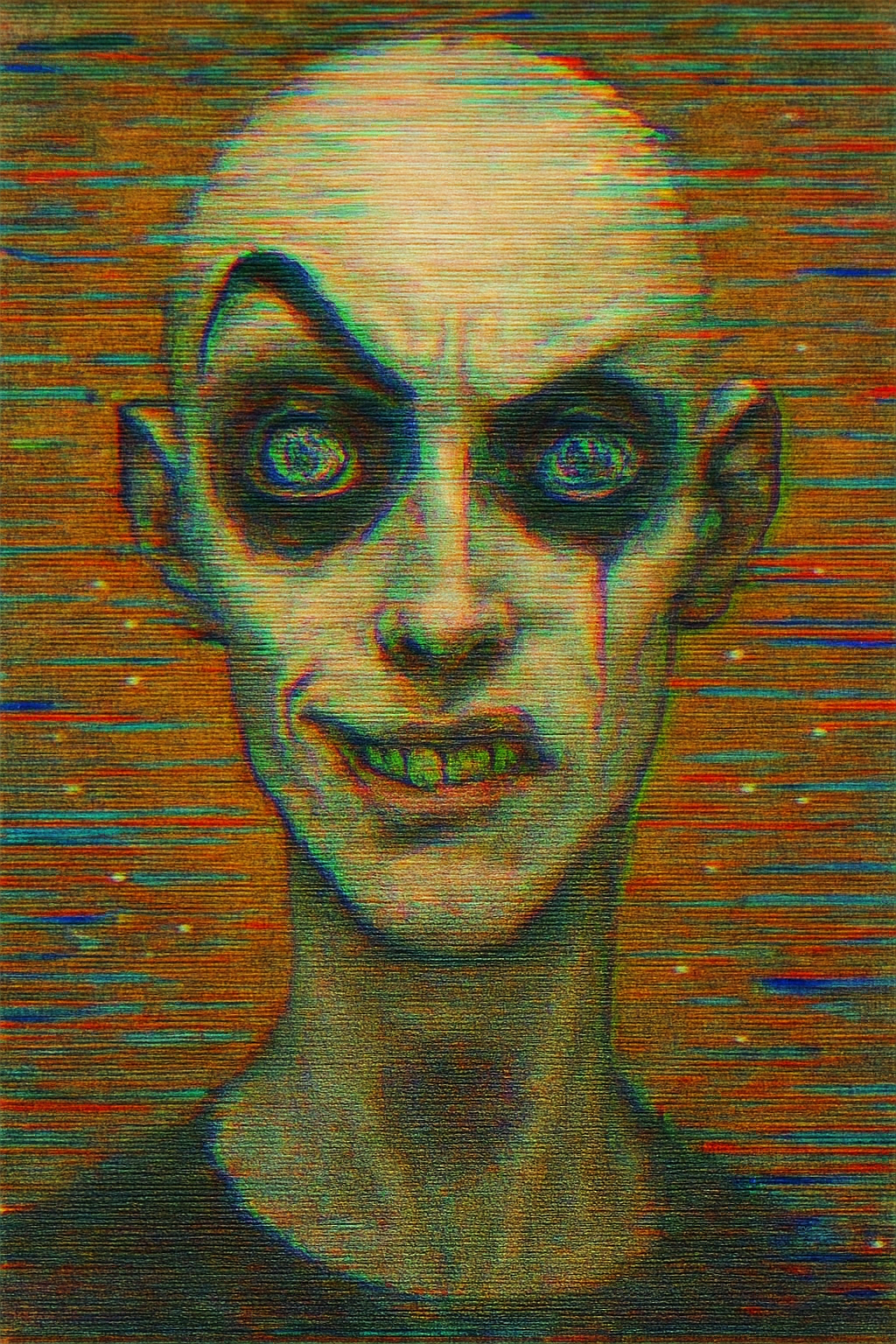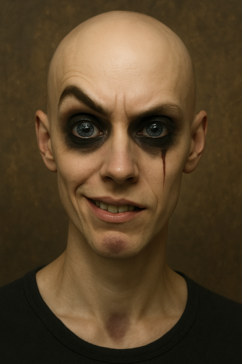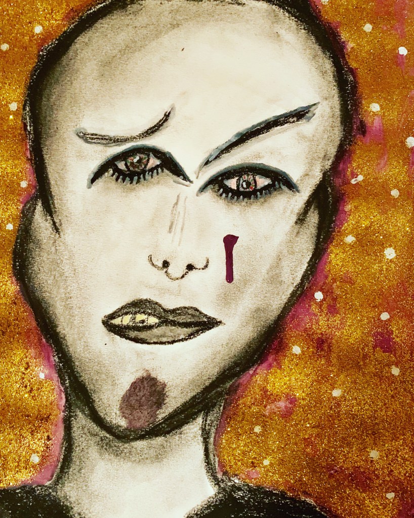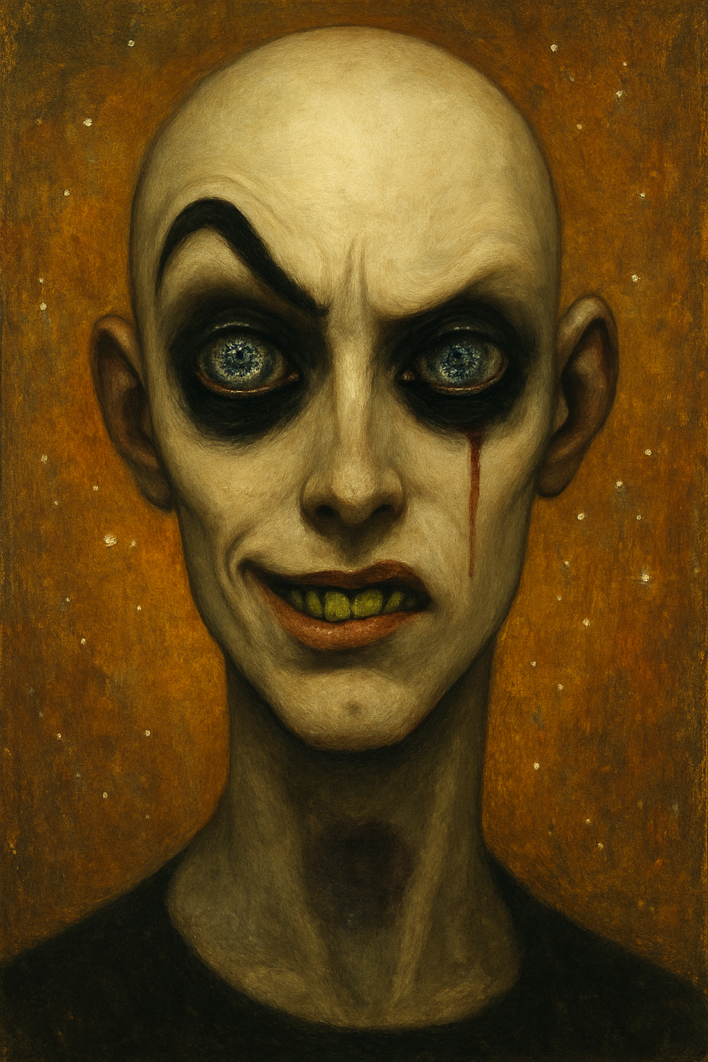 Create a surrealist portrait of an androgynous figure with an elongated, oval head and asymmetrical facial features. One eyebrow arches dramatically while the other is sharply angled, contributing to an expression of unsettling ambiguity. The eyes are hyper-detailed and reflective, as if holding galaxies or glitching spirals within them, rimmed by heavy black liner that smudges slightly downward. A single dark red tear streaks down from the right eye. The figure’s lips are uneven, with one side curled into a sardonic smirk and teeth rendered in eerie yellow tones. Below the mouth, a dark plum-colored bruise or birthmark rests on the chin. The neck is long and shadowed, blending into a stark, nearly formless body. Surround the figure with a shimmering background of burnt gold and orange, textured with scattered white flecks like stars or snow. The overall tone should feel cosmic, melancholic, and slightly vampiric, as if the subject exists between realities.