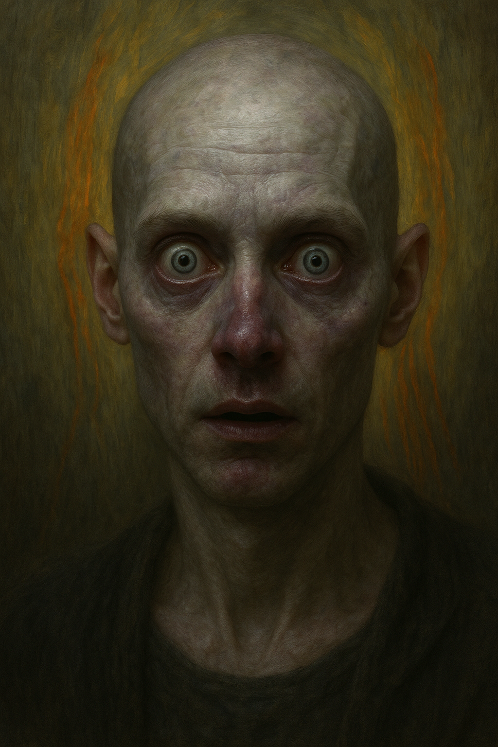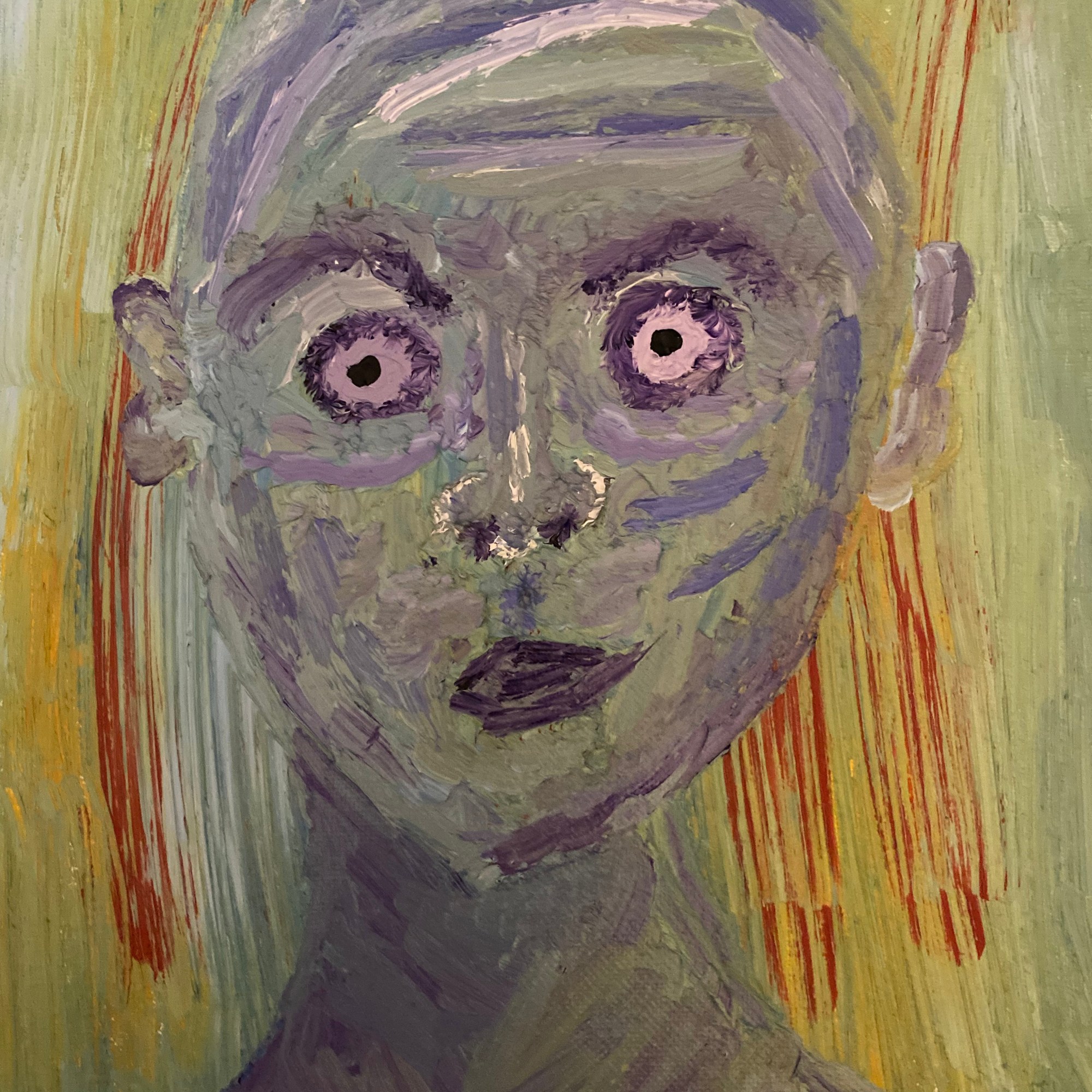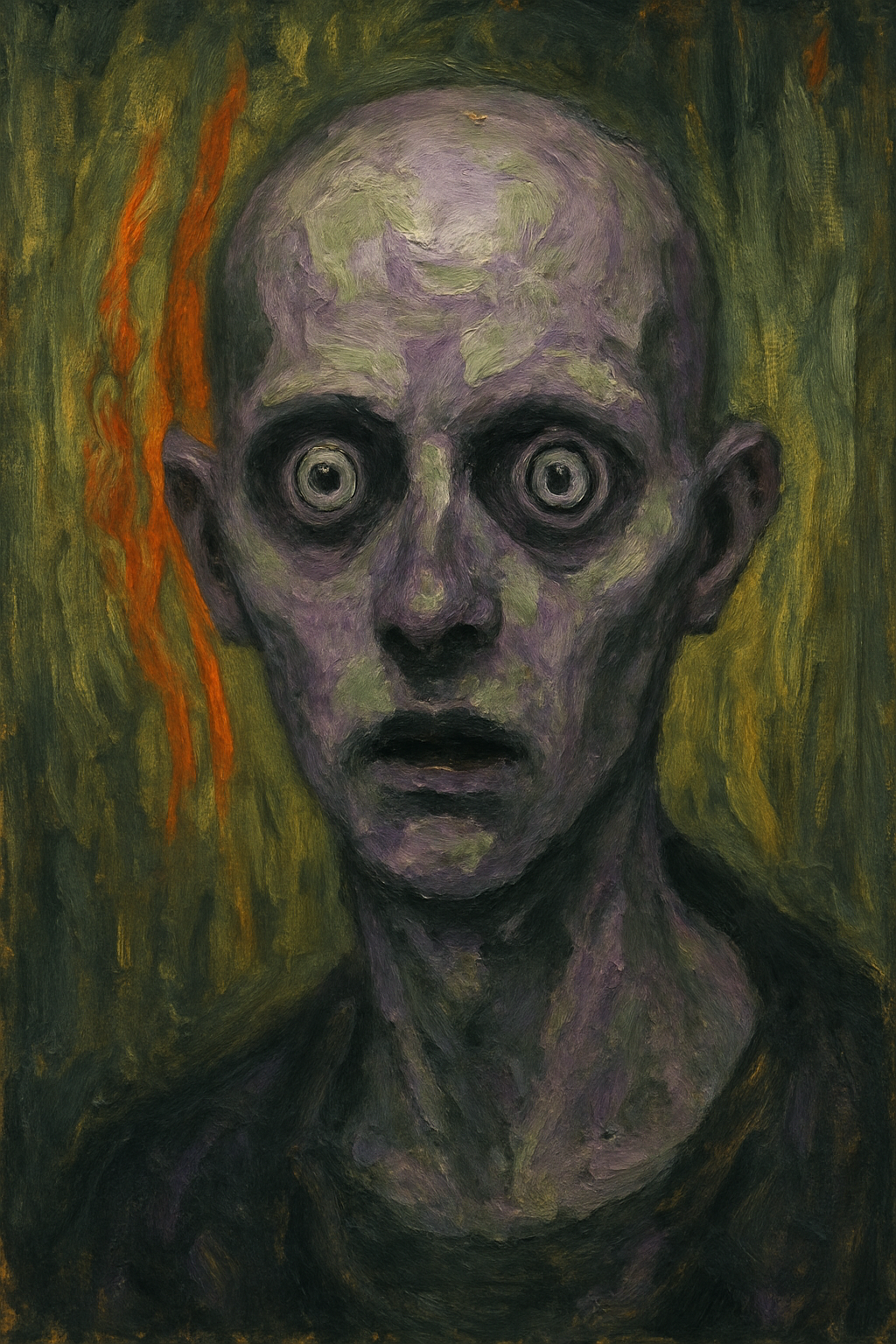 Paint a haunting, expressionist-style portrait of a bald, androgynous figure with wide, spiraled eyes and an unsettling stare. The face is rendered in thick, textured brushstrokes of muted purples and greens, with blotches of lavender, lilac, and pale chartreuse blending together to form a ghostly complexion. The background is a distorted field of vertical strokes in sickly yellows, murky greens, and streaks of red-orange that resemble both flame and hair, giving the figure a surreal, almost supernatural aura. The nose appears smudged or bruised, and the mouth is slightly ajar, dark and off-center, as if mid-thought or mid-scream. The overall mood is tense, uncanny, and intimate — like catching someone in the middle of remembering something they shouldn’t have.