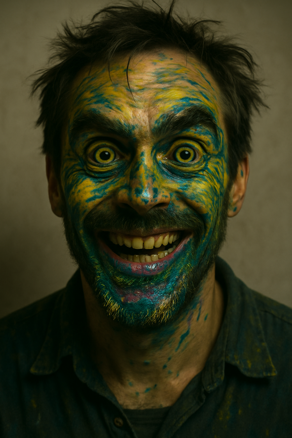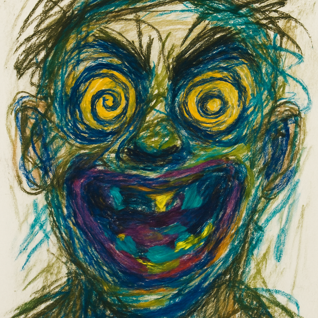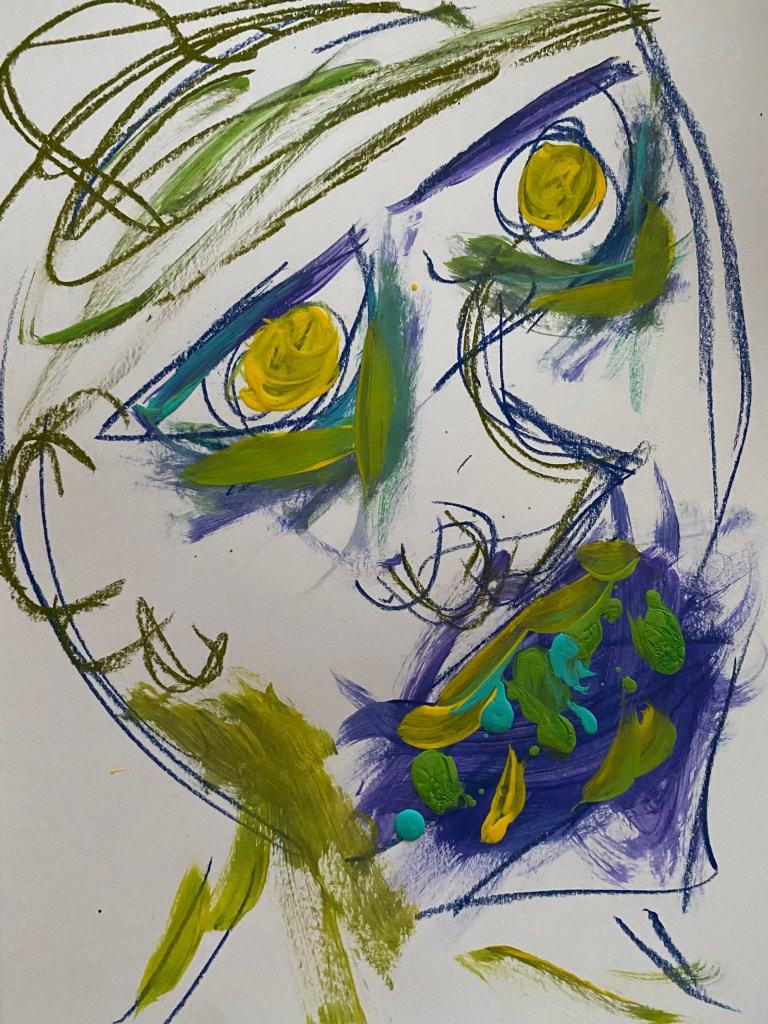 Paint a haunting, expressionist-style portrait of a bald, androgynous figure with wide, spiraled eyes and an unsettling stare. The face is rendered in thick, textured brushstrokes of muted purples and greens, with blotches of lavender, lilac, and pale chartreuse blending together to form a ghostly complexion. The background is a distorted field of vertical strokes in sickly yellows, murky greens, and streaks of red-orange that resemble both flame and hair, giving the figure a surreal, almost supernatural aura. The nose appears smudged or bruised, and the mouth is slightly ajar, dark and off-center, as if mid-thought or mid-scream. The overall mood is tense, uncanny, and intimate — like catching someone in the middle of remembering something they shouldn’t have.