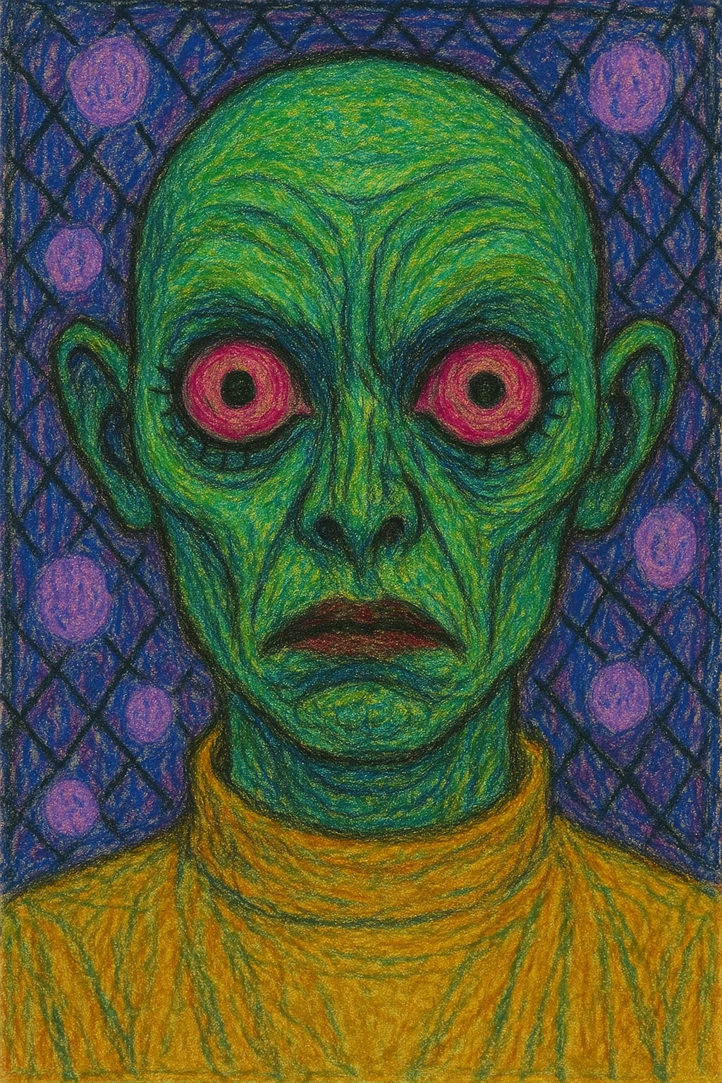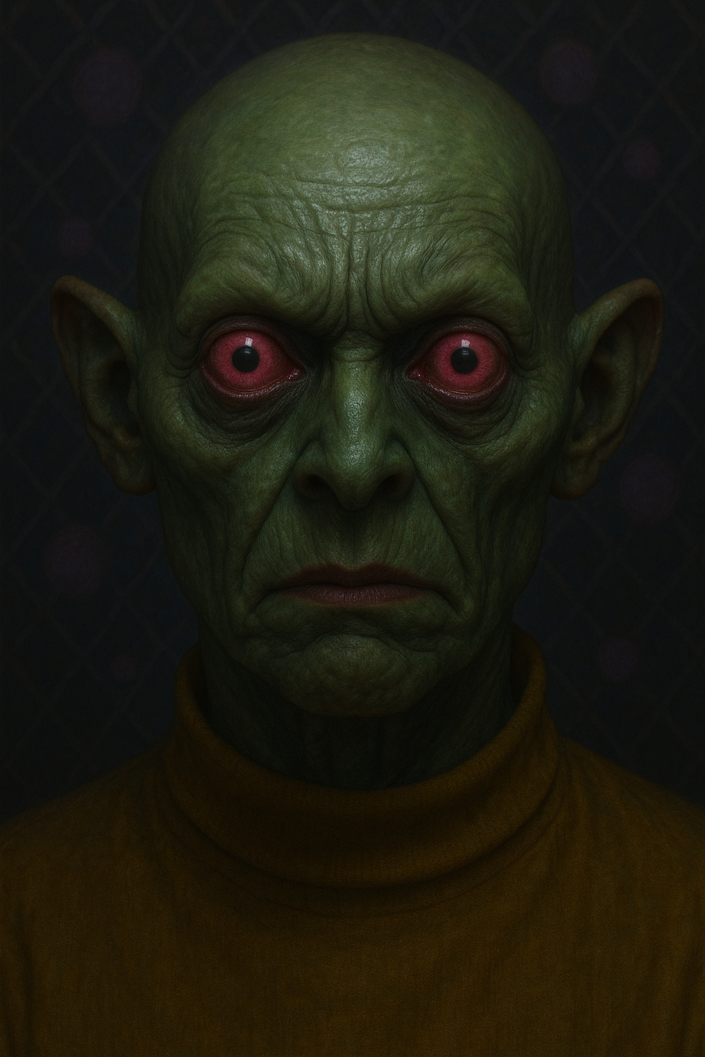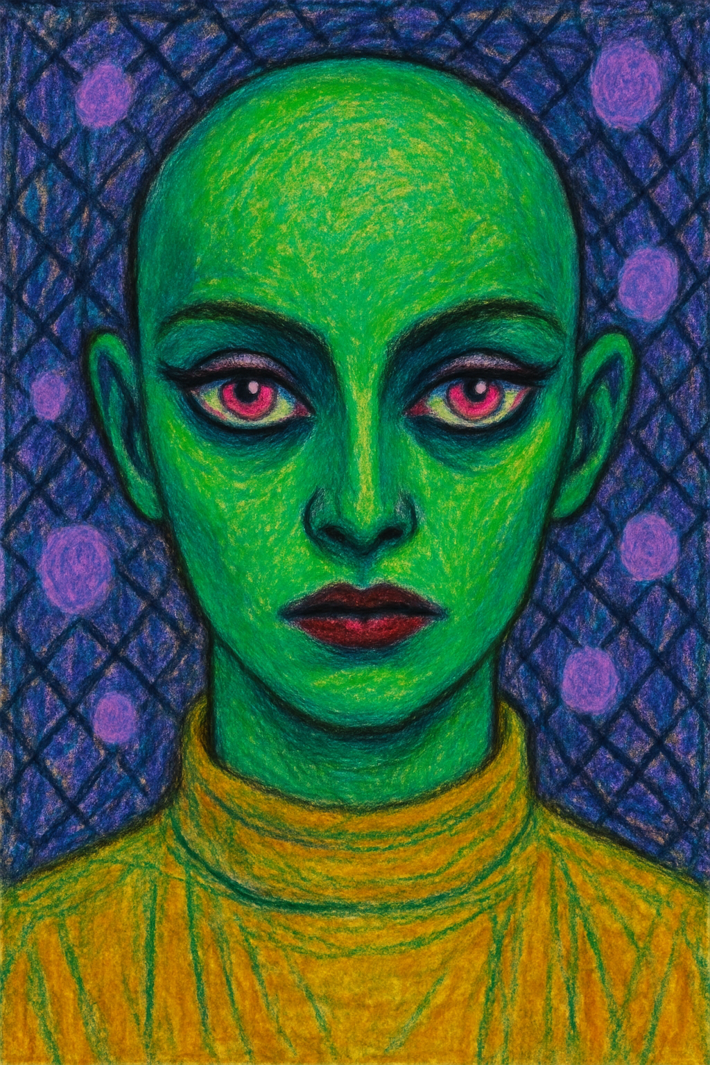 Create a surreal portrait of an androgynous, bald figure with luminous green skin and hauntingly vivid magenta-pink irises. The eyes are wide, alert, and slightly tilted, framed by thick, expressive black eyeliner and delicate lashes. The expression is stoic—neither welcoming nor cold, but suspended in ambiguity. The lips are deep red, shaped with a painterly curve that hints at quiet resistance.
