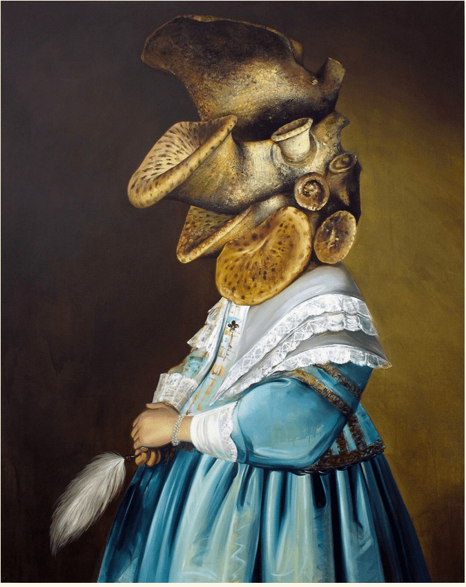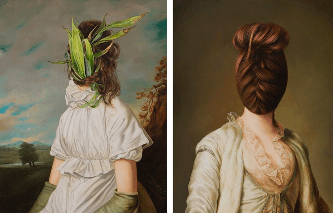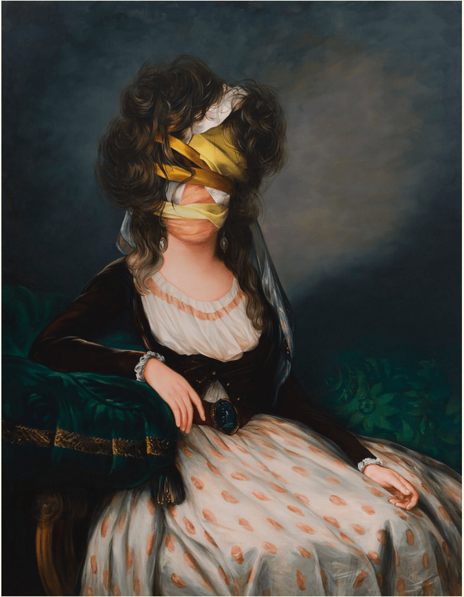 She takes classical oil portraits of women and surgically reconfigures them: same posture, same drapery, same painterly finesse—but the identity is removed. Disguised. Swallowed. Rewilded.