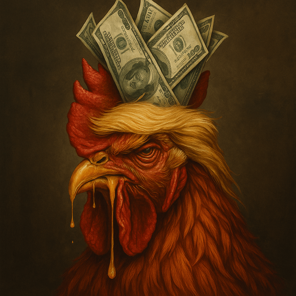 VanGod—the mother of capitalism, now more algorithm than corporation—owned all poultry in the western hemisphere and was deep in price negotiations with Hong Kong, reluctant to let go of its chickens. A long-standing resentment from the TikTok wars lingered—something about ‘homogenizing the Asian.’ But no one remembered the details anymore. Hedge funds were pouring money into backyard coops and watering houses, while McDonald’s had slashed McDuffins from the menu on account of the eggless state.