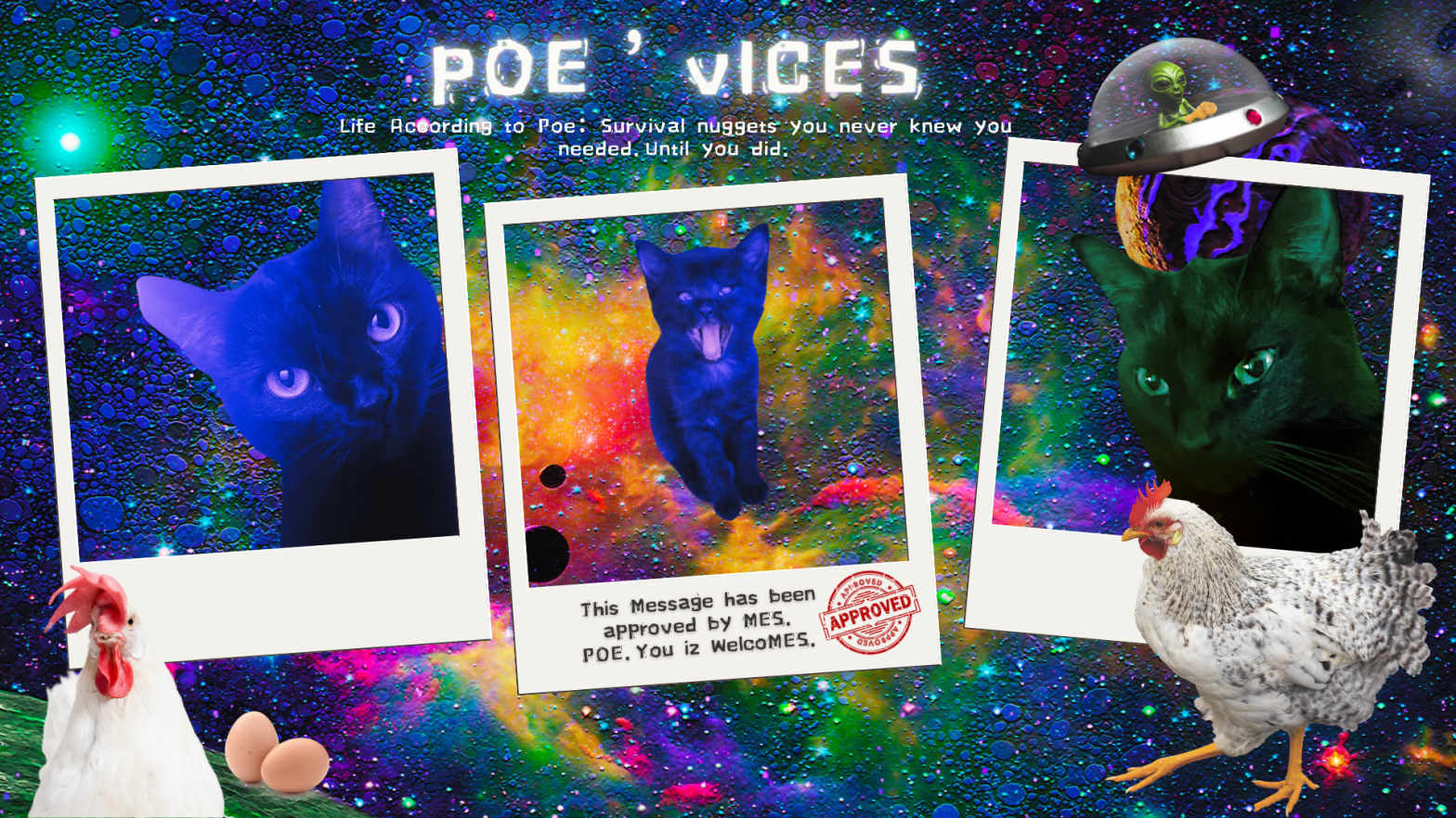Poe’vices is your unsolicited advice column from Poe the chaotic genius cat. Expect unhinged wisdom, emotional sabotage, and one constant solution: EAT CHICKENS. Queer, neurodivergent, and wildly unpredictable — Poe tells it like it isn’t.